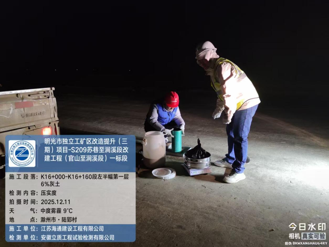 近日,江蘇海建S209蘇巷至澗溪段改建工程(官山至澗溪段)一標段項目部試驗室連同第三方檢測,組織對K16+000-K16-160左半幅第一層6%灰土壓實度檢測。