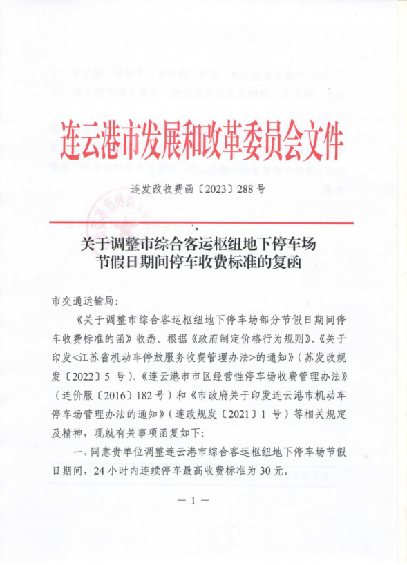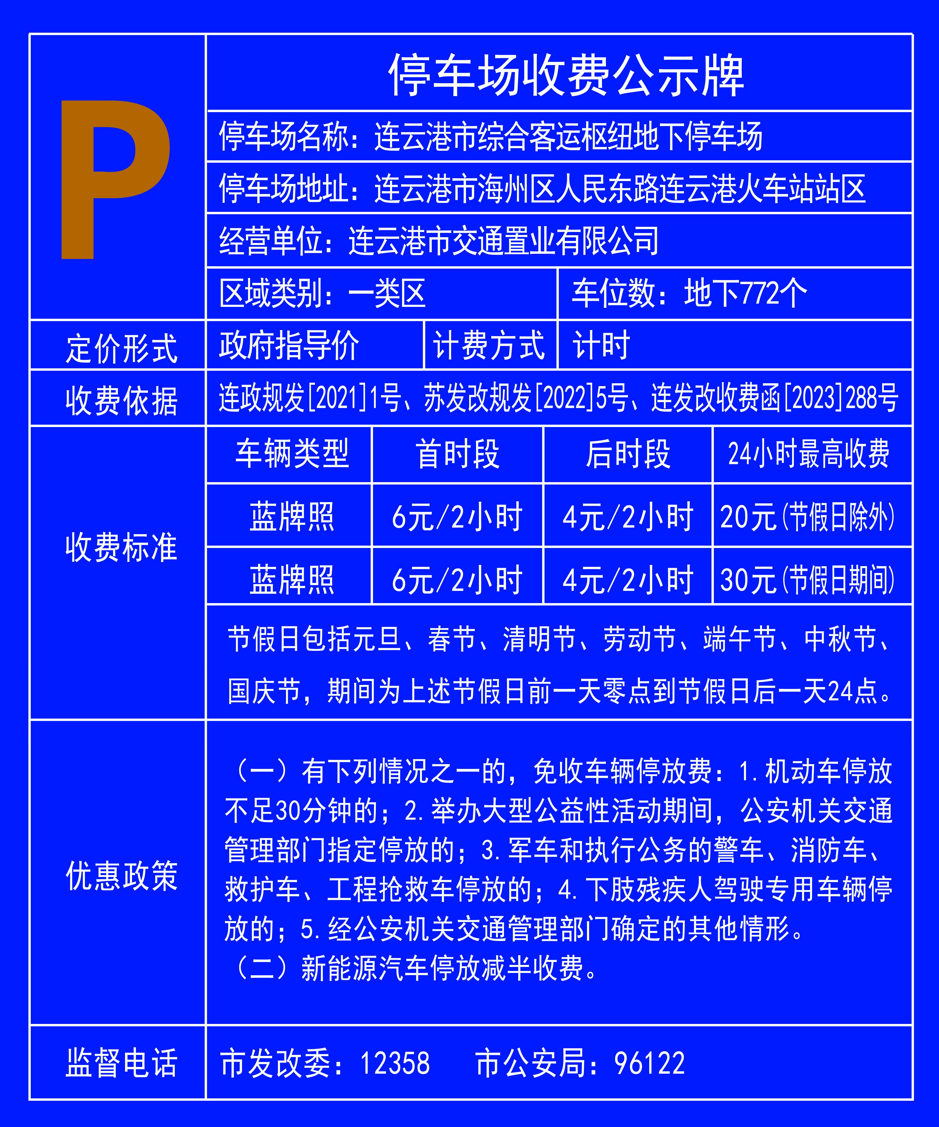 根據(jù)《政府制定價格行為規(guī)則》、《關(guān)于印發(fā)<江蘇省機動車停放服務收費管理辦法>的通知》(蘇發(fā)改規(guī)發(fā)〔2022〕5號)、《連云港市市區(qū)經(jīng)營性停車場收費管理辦法》(連價服〔2016〕182號)、《市政府關(guān)于印發(fā)連云港市機動車停車場管理辦法的通知》(連政規(guī)發(fā)〔2021〕1號)和(連發(fā)改收費函〔2023〕288號)等相關(guān)規(guī)定及精神,現(xiàn)就有關(guān)事項公告如下: