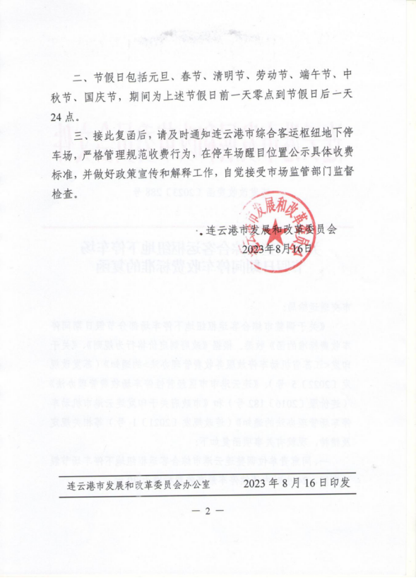 一、調(diào)整連云港市綜合客運樞紐地下停車場節(jié)假日期間24小時內(nèi)連續(xù)停車最高收費標準為30元。