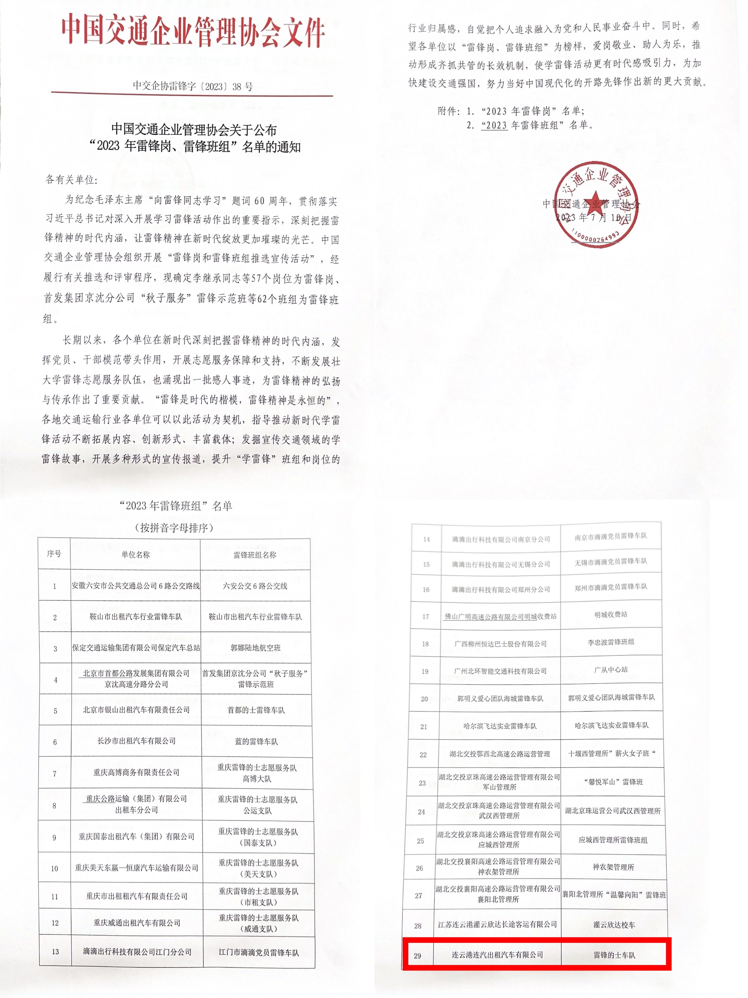 8月10日,中國交通企業(yè)管理協(xié)會公布2023年度全國交通行業(yè)雷鋒崗和雷鋒班組名單,連汽出租汽車有限公司“雷鋒的士”車隊榮獲“雷鋒班組”榮譽(yù)稱號。