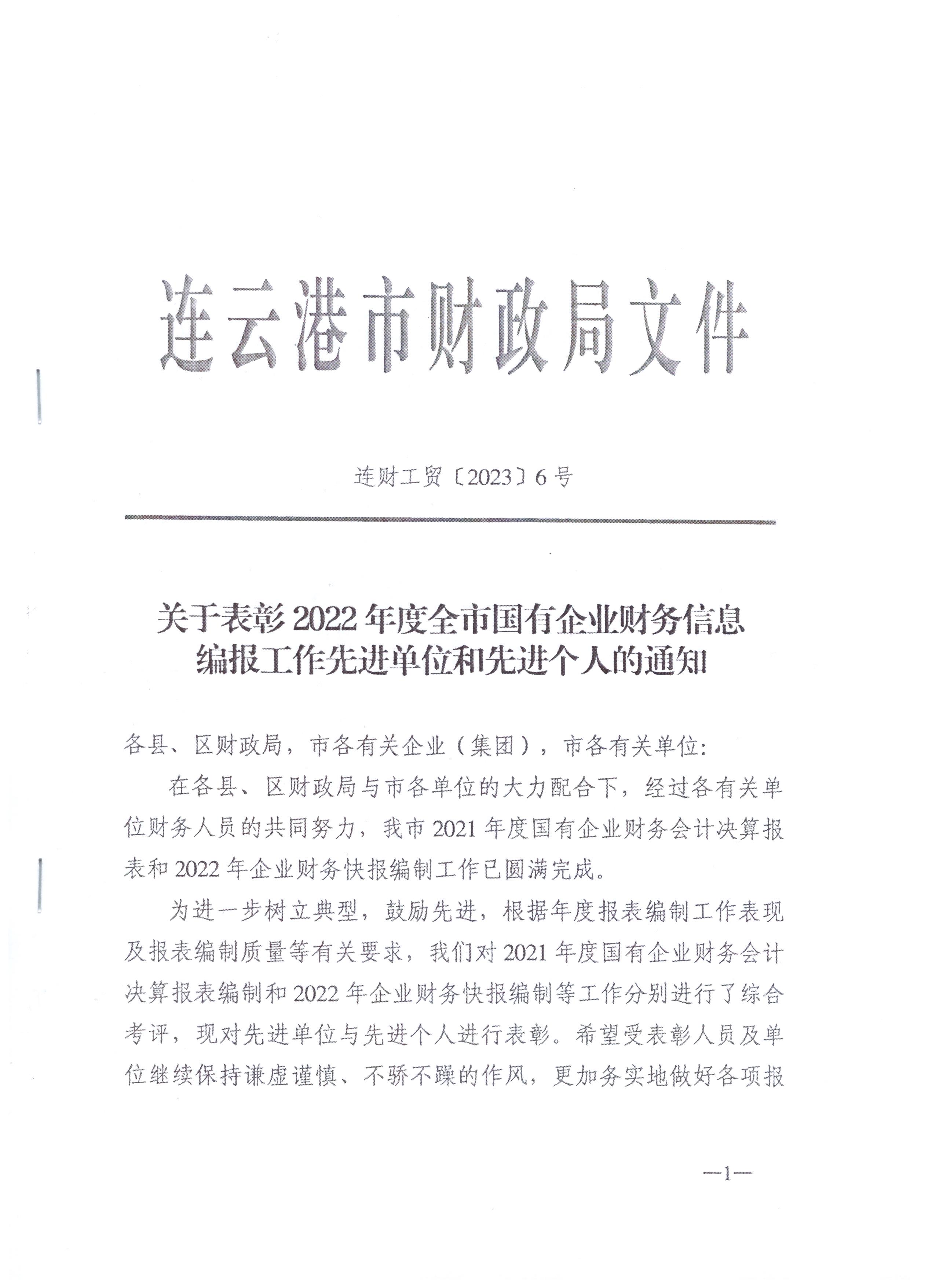 日前,從連云港市財政局下發(fā)的關(guān)于2022年企業(yè)財務(wù)快報編制工作綜合考評文件獲悉,集團被評為全市財務(wù)信息工作先進單位,集團財務(wù)融資部聶丹被評為財務(wù)信息工作先進個人。