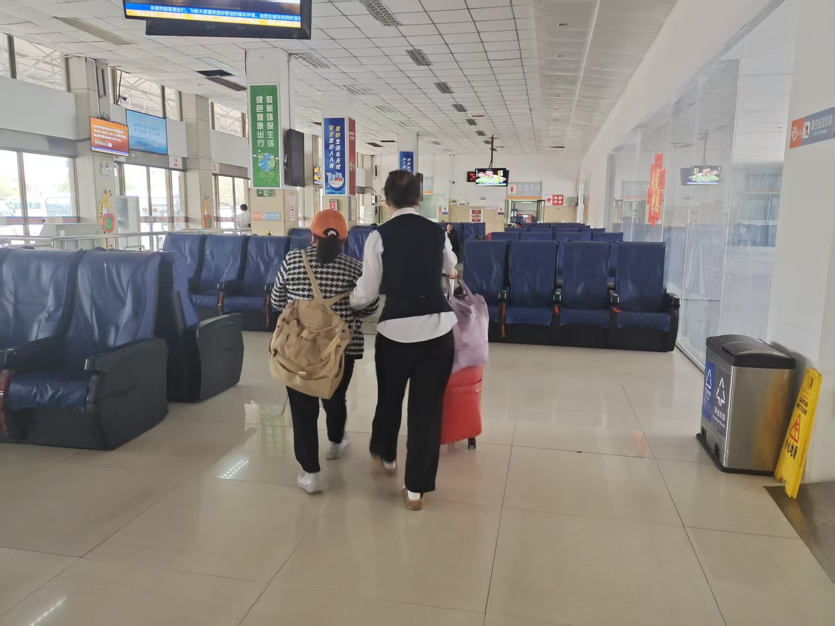 “您好,是要坐車嗎?”駱青立刻快步上前,聲音特意放輕,左手輕輕扶上旅客的胳膊肘,右手順勢接過她手里沉甸甸的布包。原來這位旅客要去沭陽,獨(dú)自出門來蘇欣快客站,剛進(jìn)門就慌了神。“您別著急,我陪您辦手續(xù)”駱青一邊安撫,一邊扶著她往購票窗口走,每過一個(gè)拐角、上一級(jí)小臺(tái)階,都輕聲提醒:“前面慢一點(diǎn),有個(gè)小坡”“窗口到了,我?guī)湍氵f身份證”。選好了去沭陽的班次,駱青幫著核對(duì)信息,把車票和身份證小心翼翼塞進(jìn)旅客手心:“您拿好,我扶著你去檢票、乘車?!苯又樓嗔嘀及?、行李箱帶旅客過安檢、檢票。上車時(shí),駱青踩著臺(tái)階先幫旅客把行李放好,再扶著她上車坐穩(wěn),不忘叮囑駕駛員:“麻煩您路上多照看一下。”