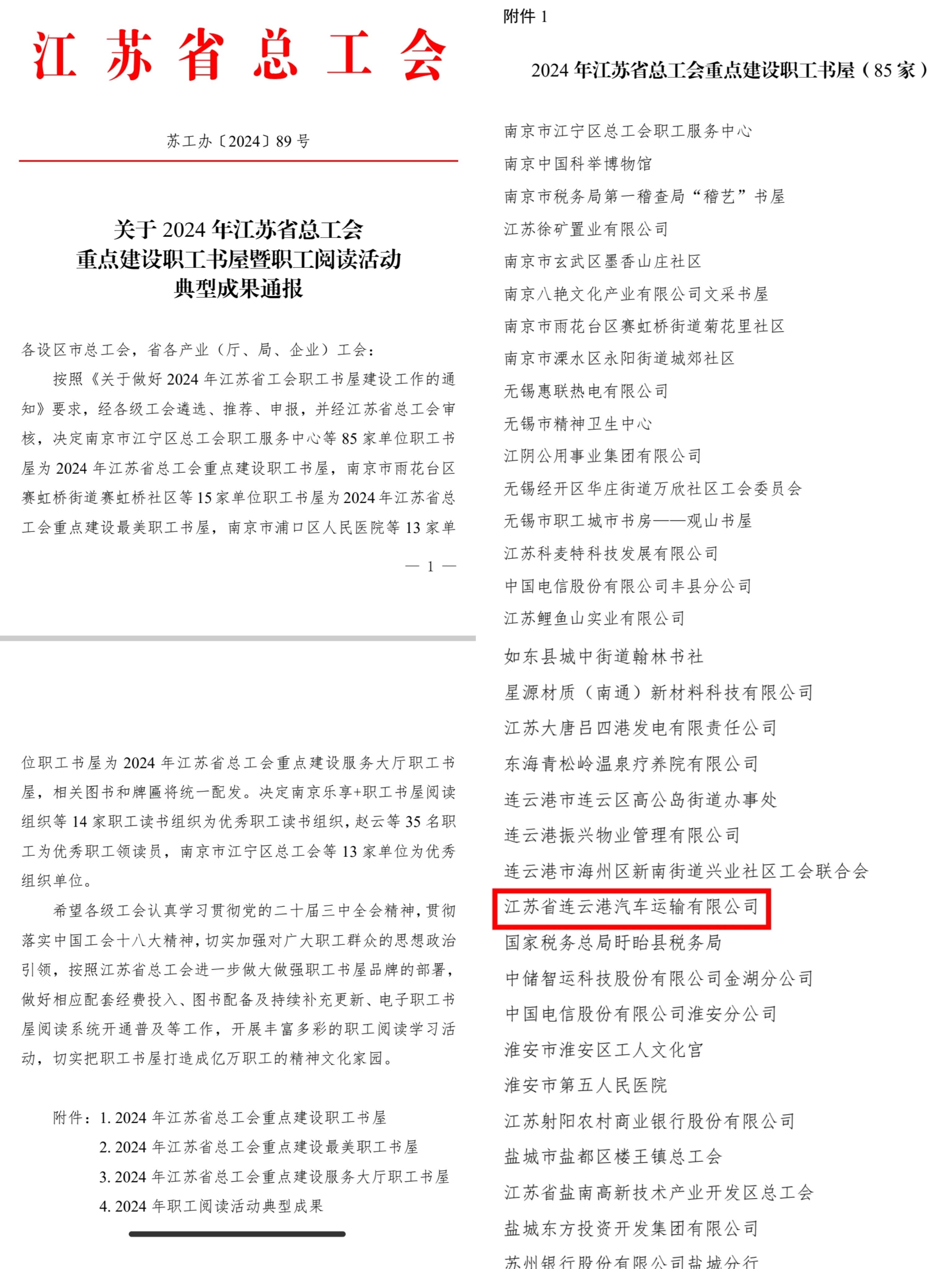 近日,從江蘇省總工會傳來喜訊,連云港汽車運(yùn)輸有限公司職工書屋榮獲2024年度江蘇省總工會重點(diǎn)建設(shè)職工書屋的稱號。