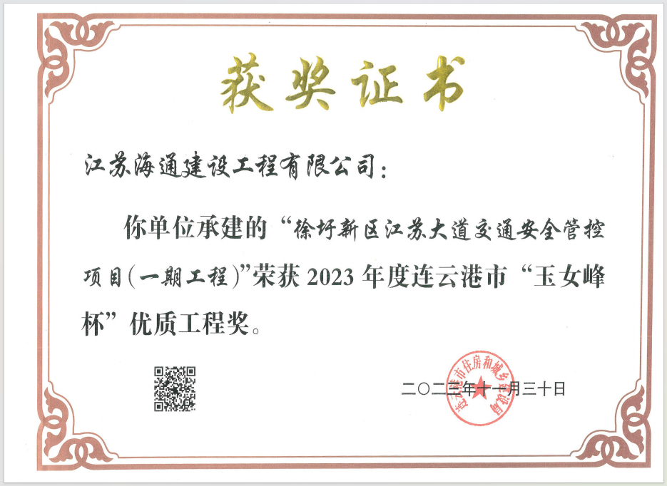 近日,從連云港住房和城鄉(xiāng)建設(shè)局獲悉,江蘇海建公司徐圩新區(qū)江蘇大道交通安全管控項目(一期工程)榮獲2023年度連云港市“玉女峰杯”優(yōu)質(zhì)工程獎。