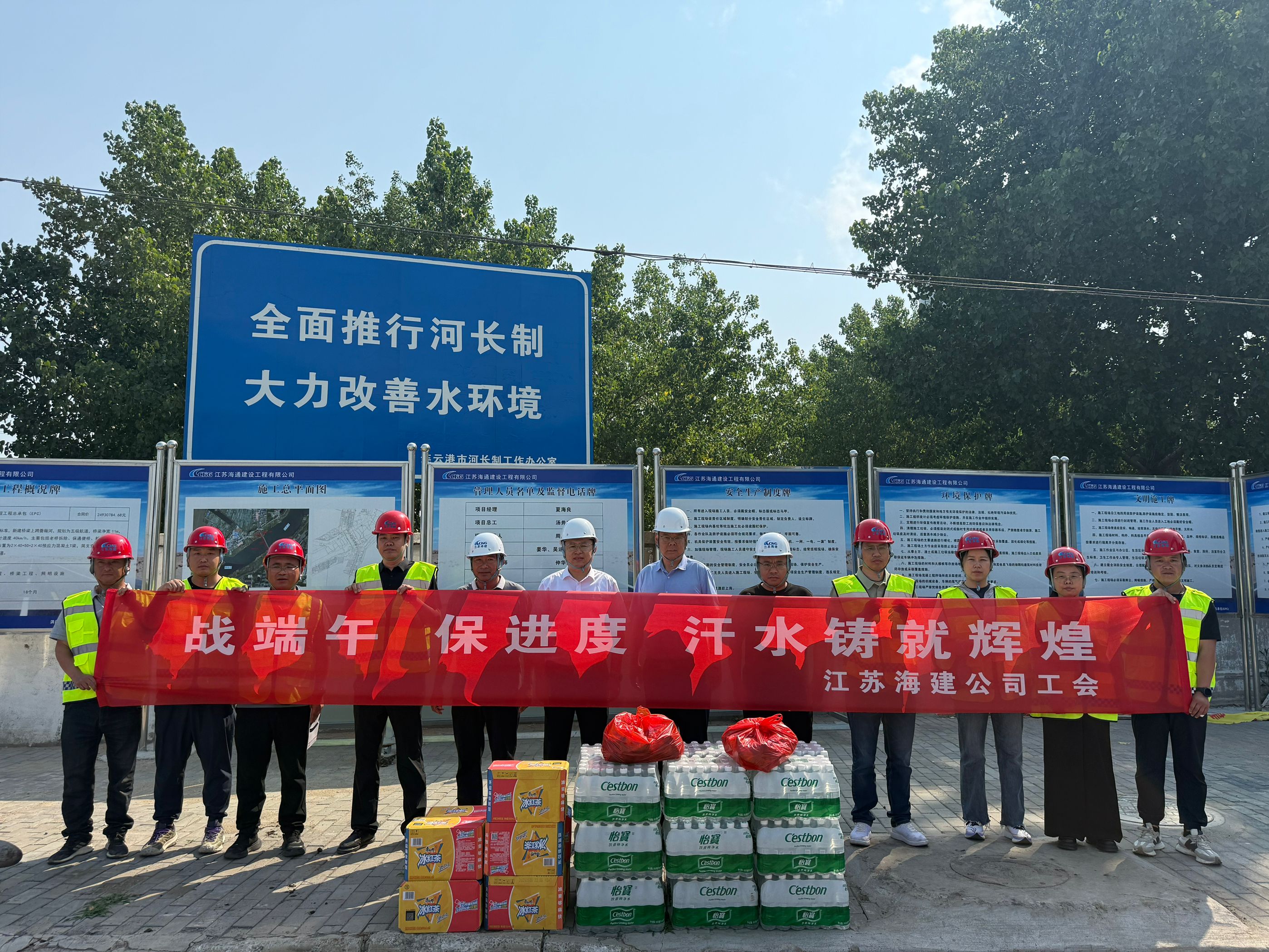 在端午節(jié)來(lái)臨之際,海建公司董事長(zhǎng)、黨委書(shū)記于振國(guó)與副總經(jīng)理、工會(huì)主席邵巍前往洪門(mén)大橋拆除新建工程和連云港市石梁河水庫(kù)生態(tài)修復(fù)二期四標(biāo)項(xiàng)目部,慰問(wèn)一線施工人員。