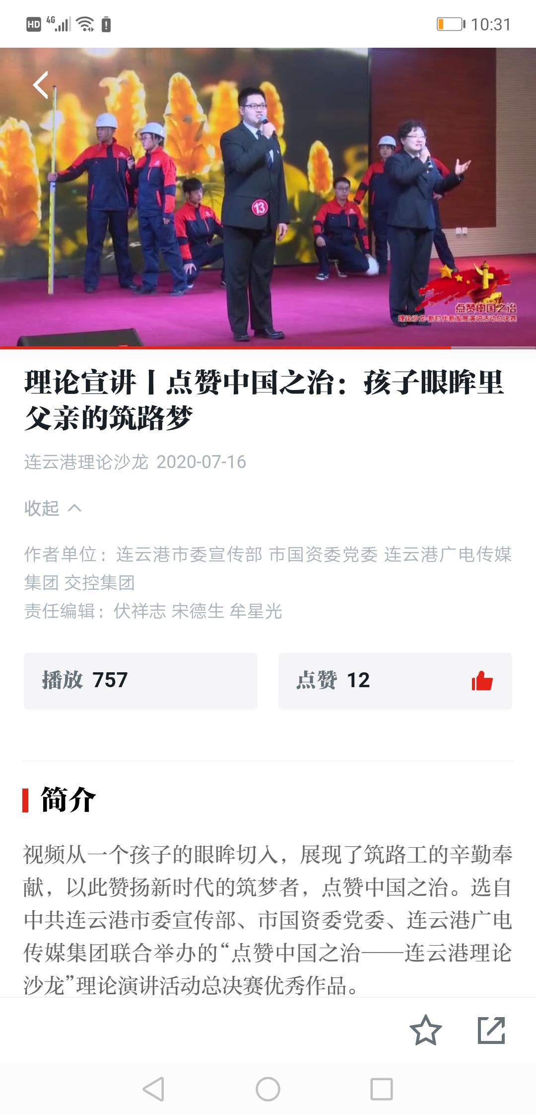 該視頻從一個(gè)孩子的眼眸切入,展現(xiàn)了交控集團(tuán)筑路工的辛勤勞動(dòng)和無私奉獻(xiàn)的精神,以此贊揚(yáng)了新時(shí)代的筑夢(mèng)者,點(diǎn)贊了中國之治。它是選自連云港市委宣傳部、連云港市國資委黨委、連云港廣電傳媒集團(tuán)聯(lián)合舉辦的“點(diǎn)贊了中國之治——連云港理論沙龍”理論演講活動(dòng)總決賽的優(yōu)秀作品。