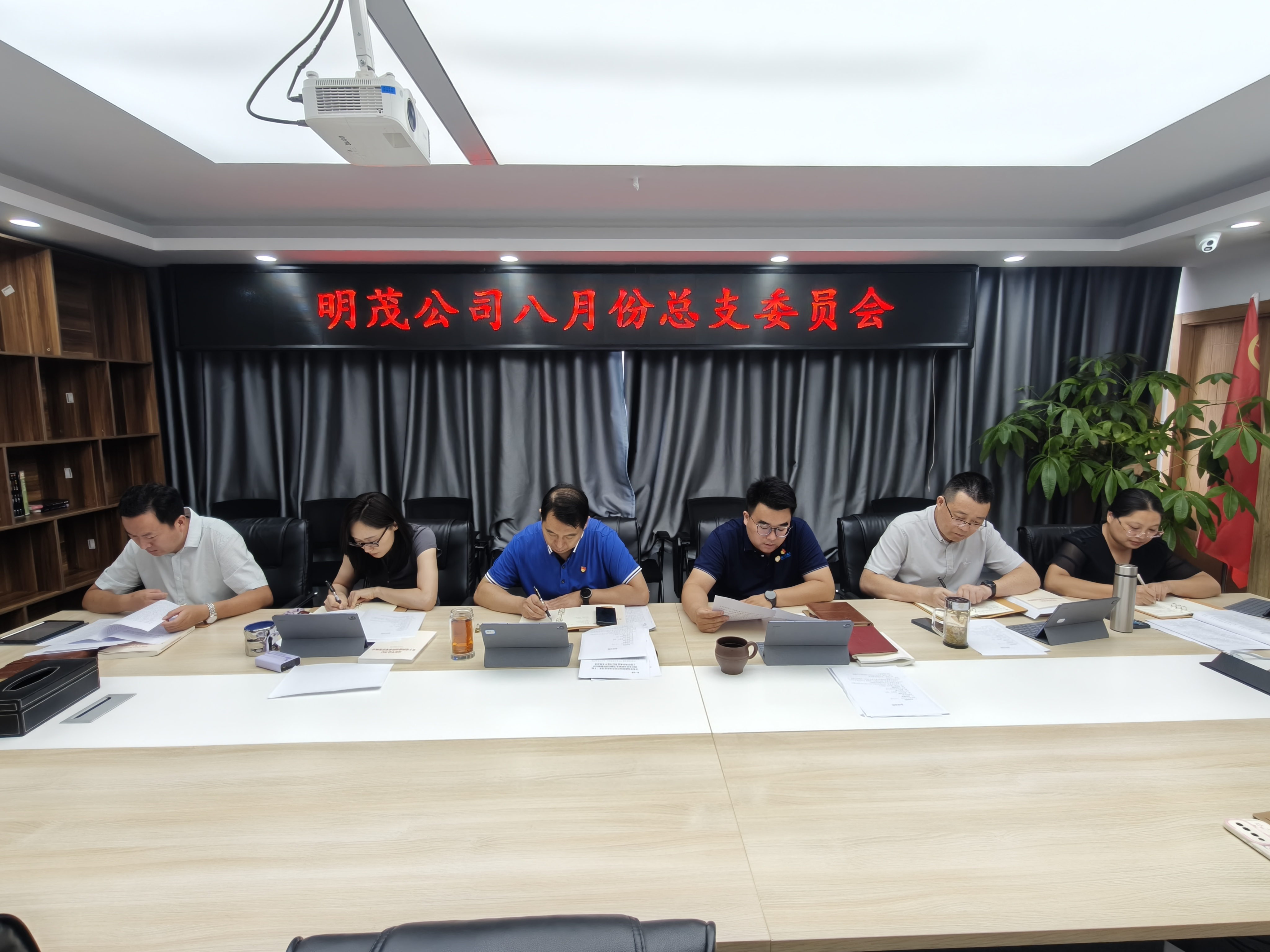 8月8日下午,明茂公司黨總支召開8月份總支委員會,傳達學習中共中央政治局會議精神,部署貫徹落實工作。會議由公司黨總支書記、董事長袁軍同志主持召開。明茂公司領導班子成員參加會議、相關部門負責人列席會議。