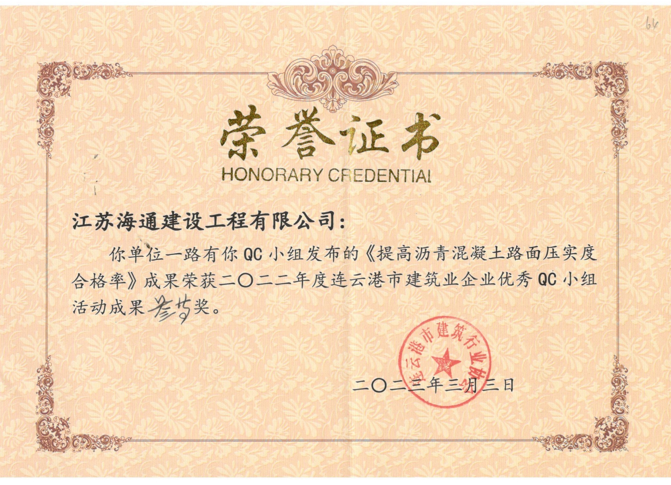 3月3日,連云港市建筑業(yè)協(xié)會舉辦了2022年度連云港市建筑業(yè)優(yōu)秀QC小組活動成果發(fā)布會,全市各行業(yè)共有74項課題成果參加了本次發(fā)布會,海建公司選送的2個QC成果均獲得了市級獎項。