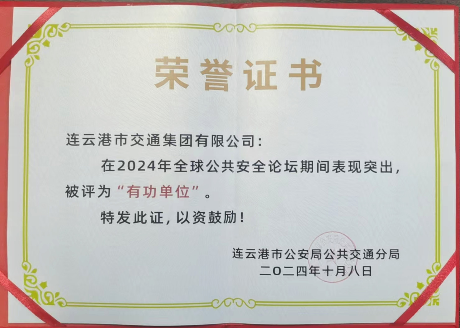 交通集團憑借卓越的服務(wù)質(zhì)量和高度的社會責(zé)任感,榮獲了由市人民檢察院、市公安局公共交通分局、連云港火車站站前廣場管理服務(wù)工作領(lǐng)導(dǎo)小組辦公室頒發(fā)的榮譽證書,以及市發(fā)展和改革委員會贈送的錦旗。