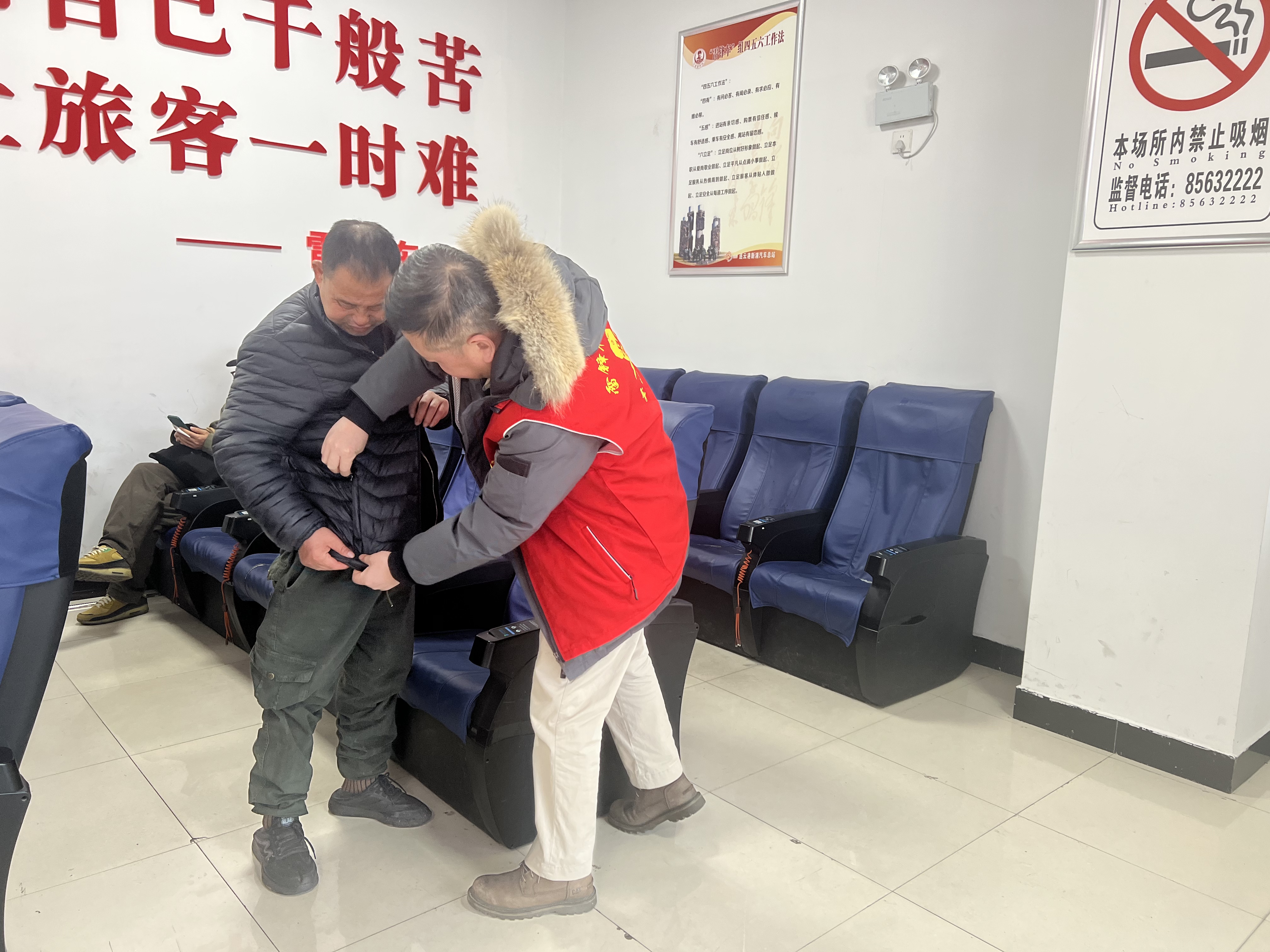 在售票廳,高波師傅一邊比劃,一邊向售票員說明情況。售票員迅速為旅客辦理好前往陳家港的車票。隨后,高波又細心地幫助旅客通過安檢,并耐心地向他交代路上的注意事項,如保管好行李、不要隨意下車等。