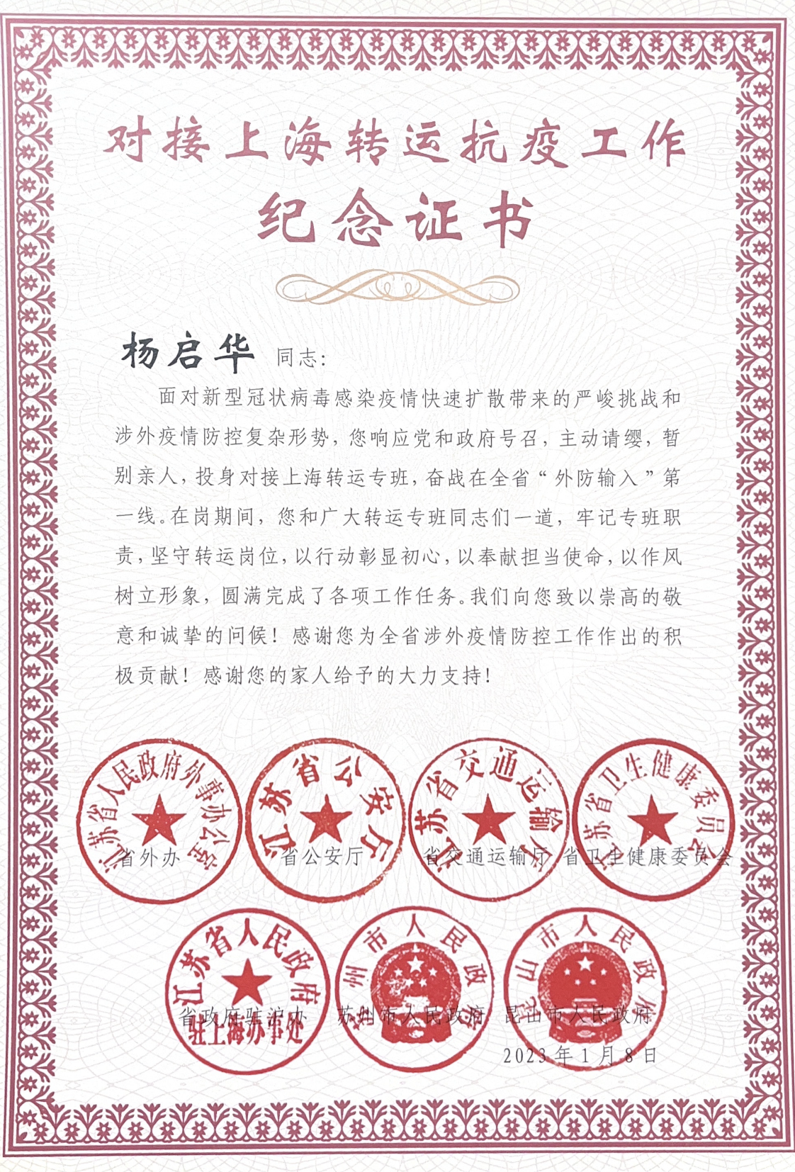 近日,汽車公司收到由省外辦、省公安廳、省交通運(yùn)輸廳、省衛(wèi)生健康委員會(huì)、省政府駐瀘辦、蘇州市人民政府、昆山市人民政府共同頒發(fā)的44份對(duì)接上海轉(zhuǎn)運(yùn)抗疫工作紀(jì)念證書,向支援疫情防控工作的集體和個(gè)人表示了誠(chéng)摯的謝意。