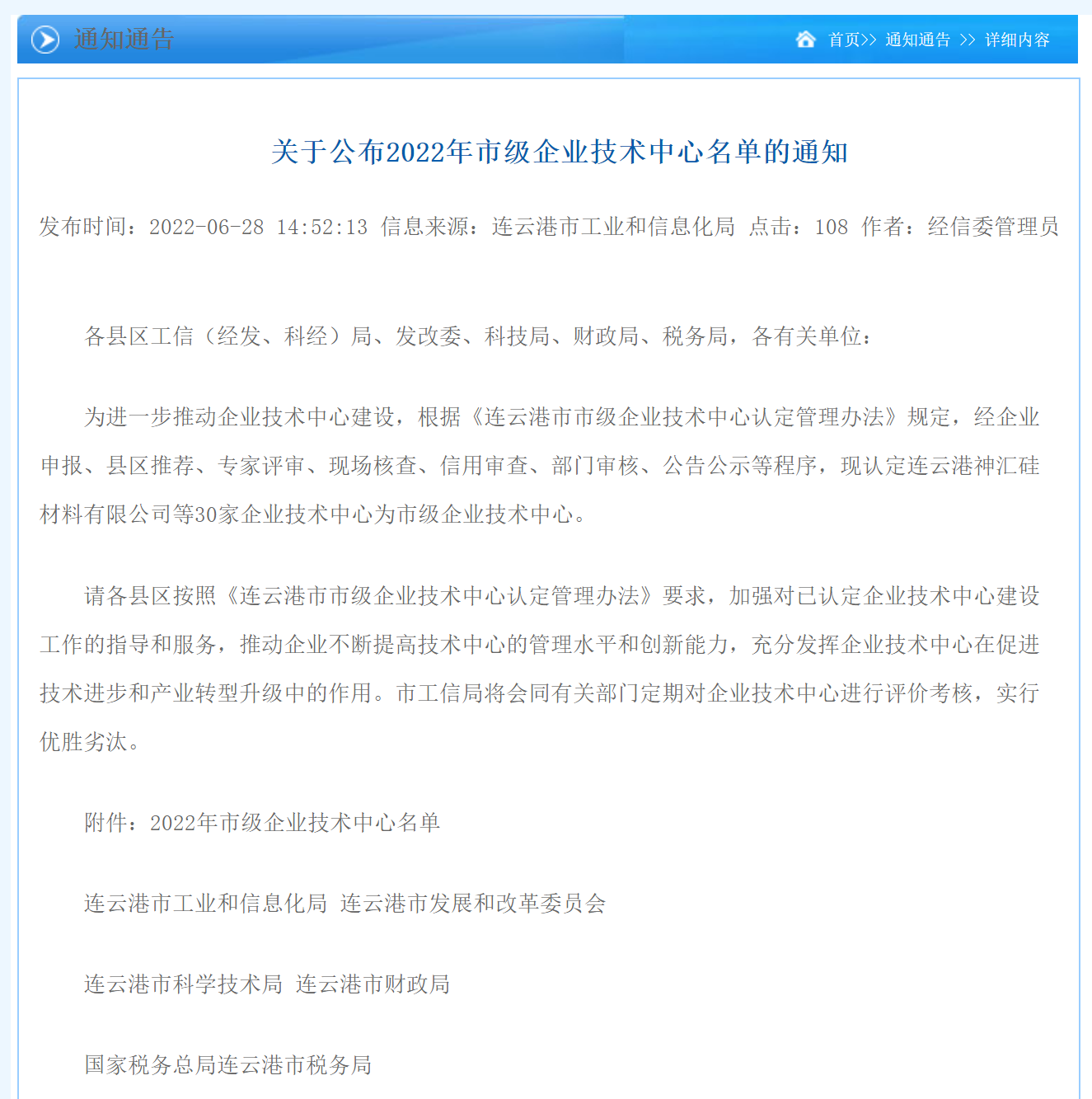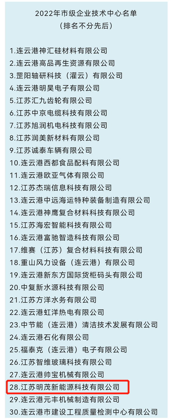 6月28日,連云港市工業(yè)和信息化局在官方網(wǎng)站發(fā)文,根據(jù)《連云港市認定企業(yè)技術(shù)中心管理辦法》,認定明茂公司為2022年連云港市企業(yè)技術(shù)中心。