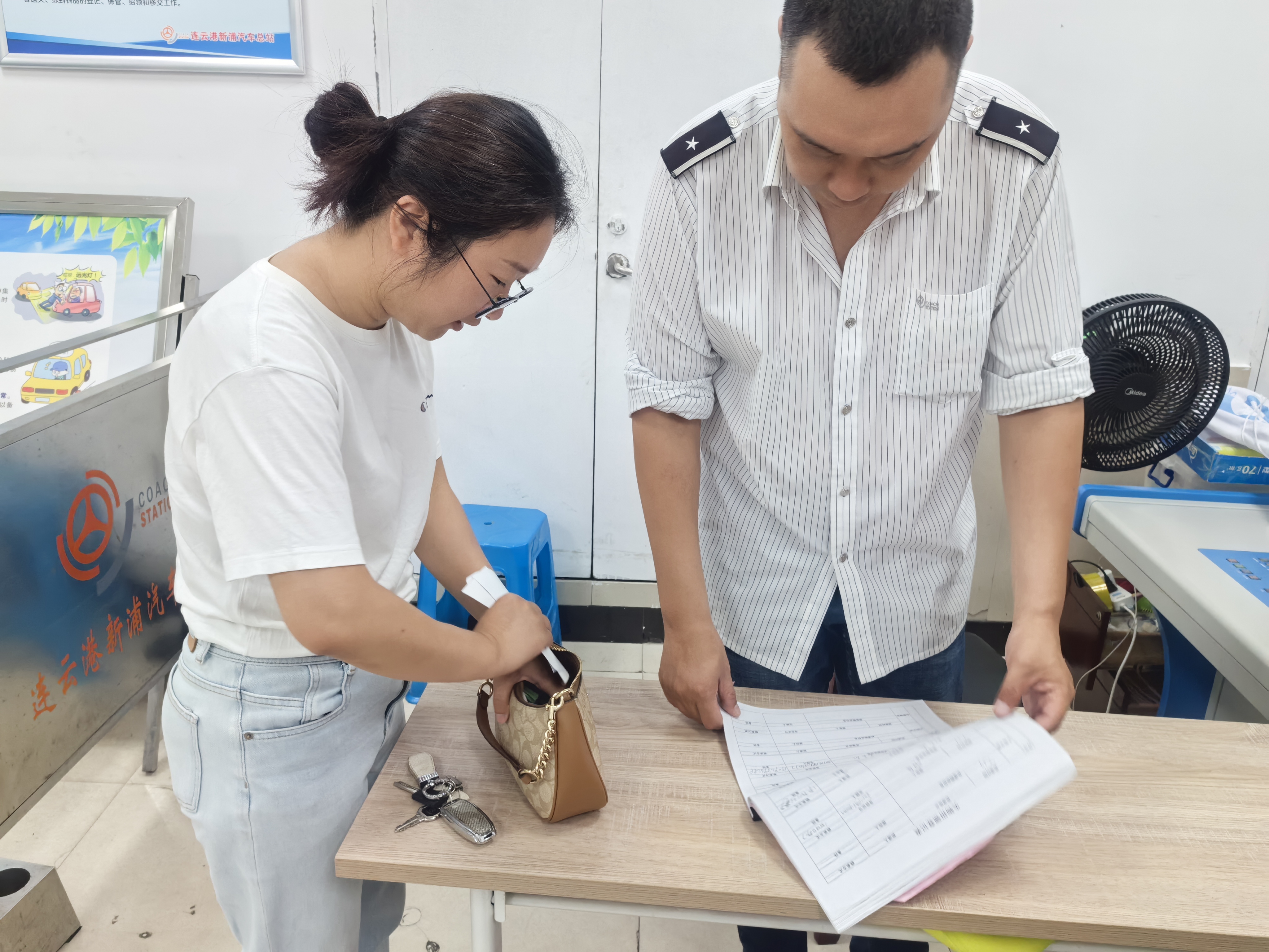 當(dāng)日下午,王建國駕駛機場巴士從花果山機場發(fā)往市區(qū),抵達新浦汽車總站后,按照慣例對車廂進行清潔。在整理后排座位時,他發(fā)現(xiàn)一個手提包遺落在座位上,此時旅客已全部下車離開。王建國第一時間檢查物品,發(fā)現(xiàn)包內(nèi)有現(xiàn)金若干、個人身份證件和銀行卡等重要個人物品,他立即將手提包送至總站“雷鋒車”組服務(wù)臺,交由工作人員登記保管。