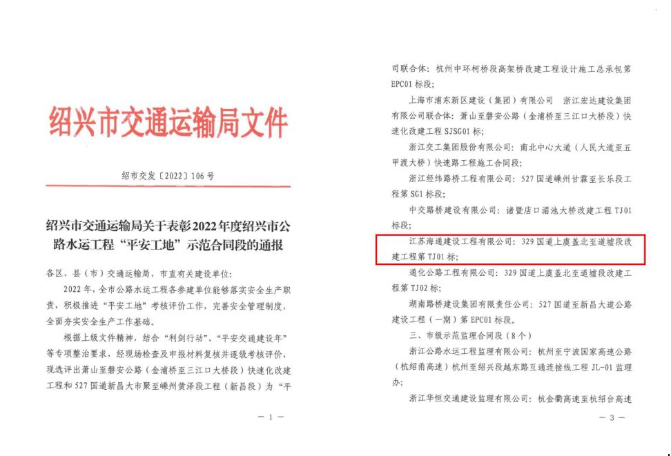 近日,從紹興市交通運(yùn)輸局處獲訊,由江蘇海建公司承建的329國(guó)道上虞蓋北至道墟段改建工程第TJ01標(biāo)榮獲紹興市市級(jí)示范“平安工地”稱號(hào)。
