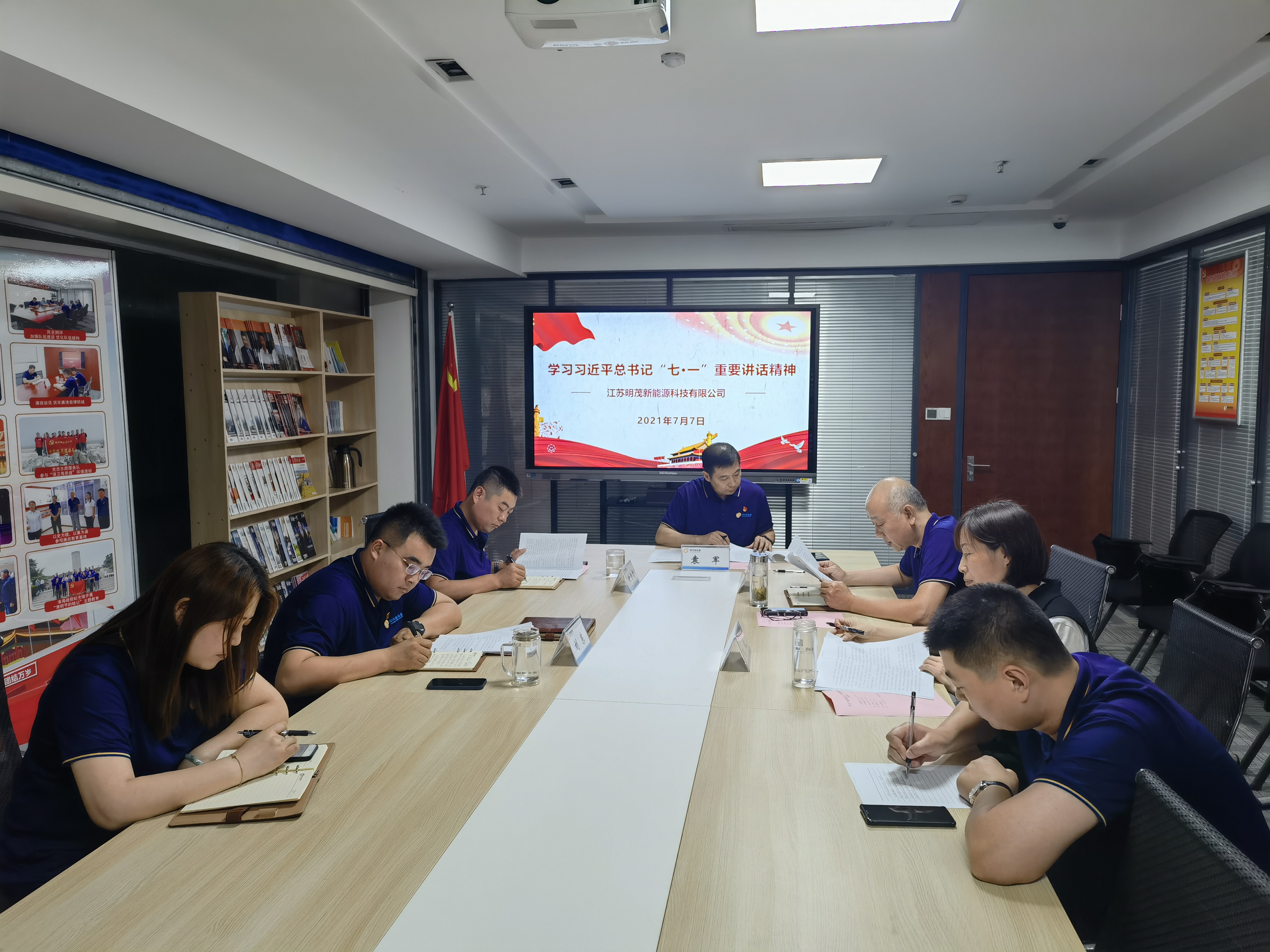 7月7日上午,明茂公司黨總支學習中心組召開會議,學習習近平總書記在慶祝中國共產黨成立100周年大會上的重要講話精神,明茂公司黨總支書記、總經理袁軍主持并講話,黨總支副書記、工會主席王冰領學,中心組成員作交流研討。