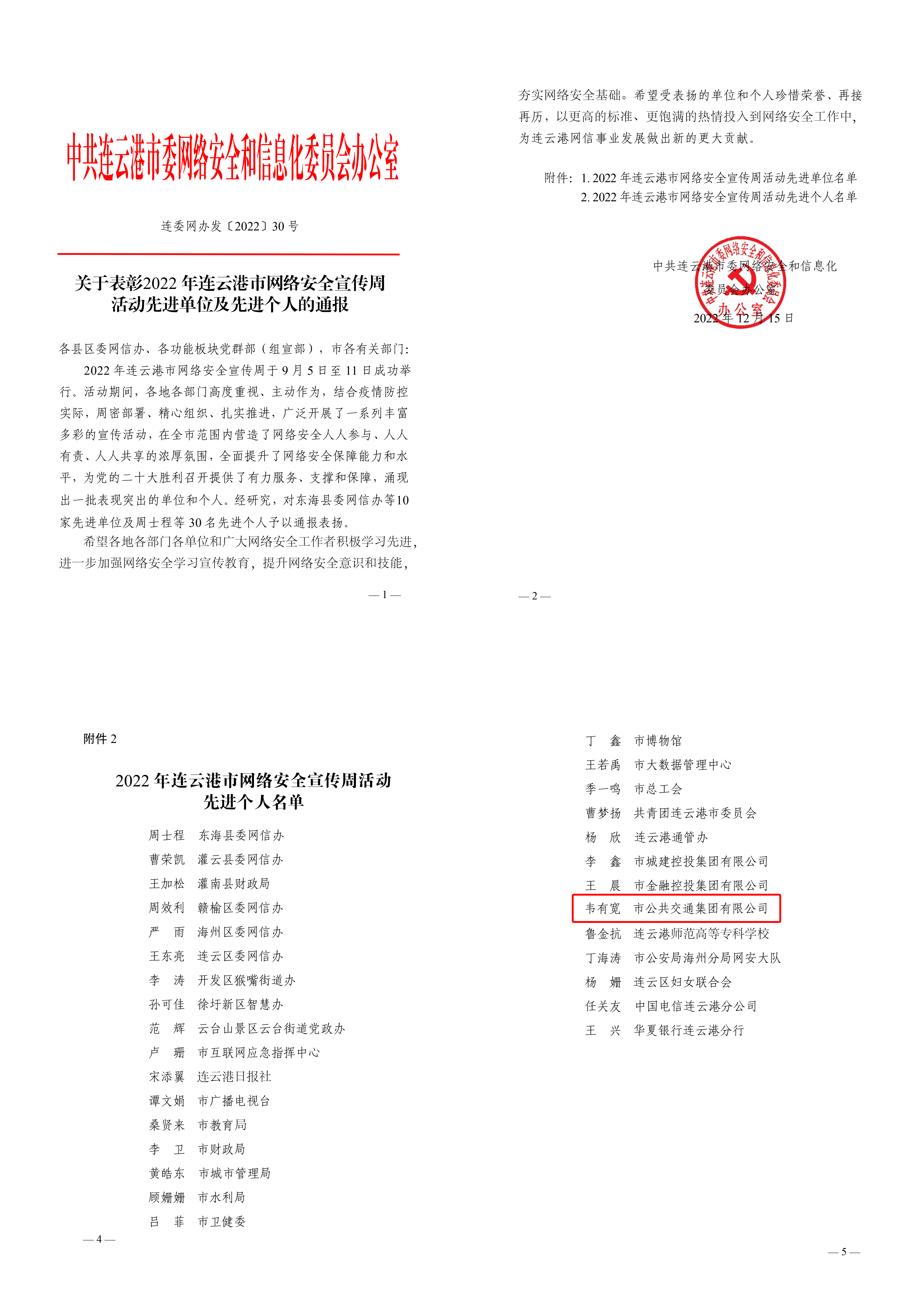 2022年連云港市網(wǎng)絡(luò)安全宣傳周于9月5日至11日成功舉行?;顒?dòng)期間,市交通控股集團(tuán)權(quán)屬公交集團(tuán)高度重視,主動(dòng)作為,廣泛開(kāi)展宣傳活動(dòng),營(yíng)造網(wǎng)絡(luò)安全人人參與、人人有責(zé)、人人共享的濃厚氛圍。公交集團(tuán)生產(chǎn)運(yùn)營(yíng)部韋有寬在宣傳活動(dòng)中表現(xiàn)突出,獲得連云港市網(wǎng)絡(luò)安全宣傳周活動(dòng)先進(jìn)個(gè)人榮譽(yù)稱(chēng)號(hào)。