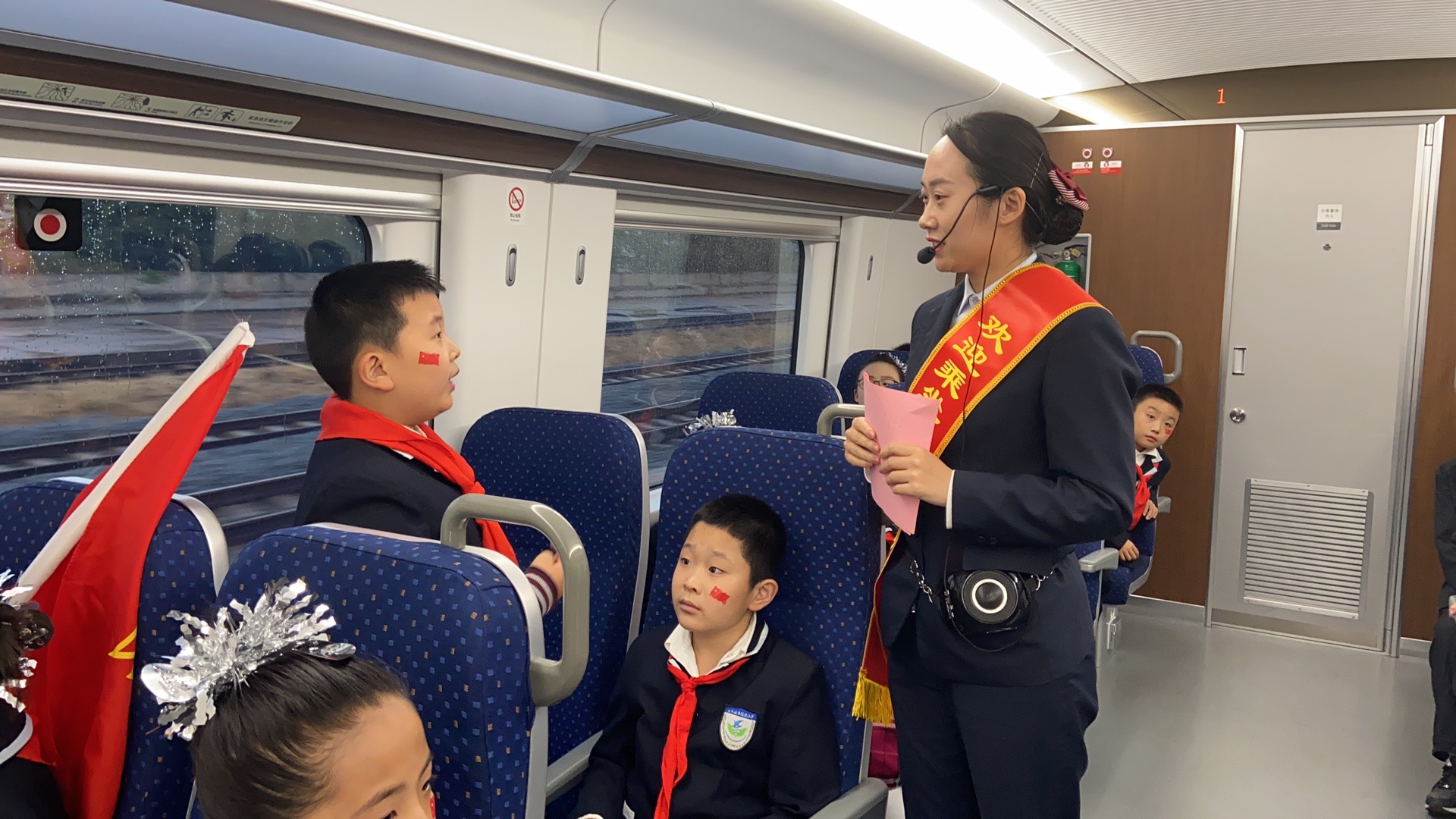 10月15日下午,院前小學(xué)“紅領(lǐng)巾巡訪隊(duì)”的隊(duì)員們,在老師的組織帶領(lǐng)下來到城市動(dòng)車連云站乘坐S3108次列車,小隊(duì)員們情緒十分激動(dòng),臉頰的左側(cè)還貼著鮮亮的“五星紅旗”,他們著裝統(tǒng)一,精神抖擻,整齊有序的跟隨著城市動(dòng)車的工作人員走進(jìn)了車廂。