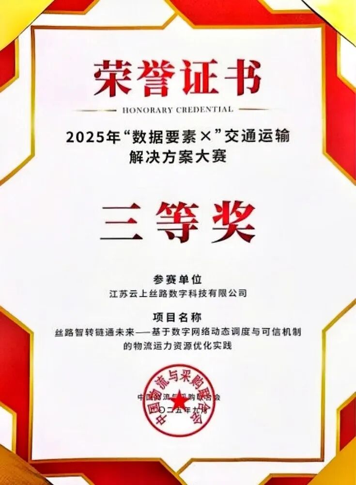 近日,2025中國物流與采購聯(lián)合會“數(shù)據(jù)要素×”交通運輸解決方案大賽全國總決賽在上海落幕,江蘇省物流產(chǎn)業(yè)促進會副會長單位——江蘇云上絲路數(shù)字科技有限公司憑借“絲路智轉(zhuǎn)鏈通未來——基于數(shù)字網(wǎng)絡(luò)動態(tài)調(diào)度與可信機制的物流運力資源優(yōu)化實踐”項目,獲大賽三等獎。