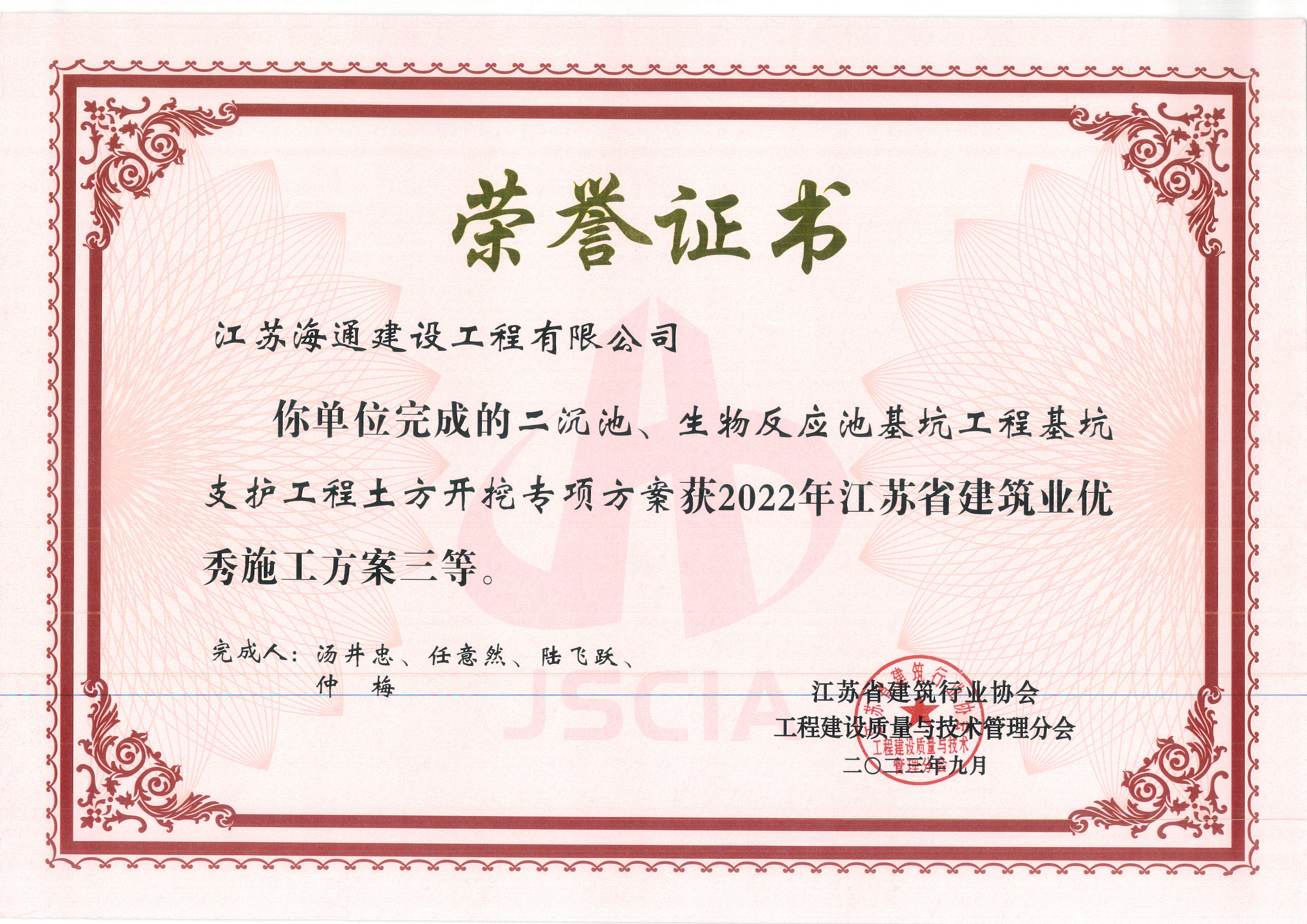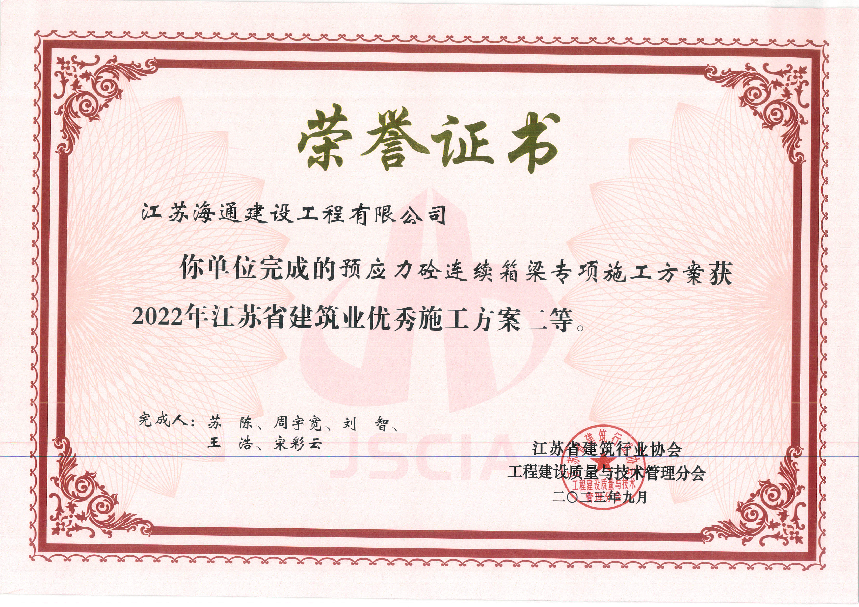 日前,從江蘇省建筑業(yè)協(xié)會(huì)獲悉,江蘇海建公司申報(bào)的《預(yù)應(yīng)力砼連續(xù)箱梁專(zhuān)項(xiàng)施工方案》和《二沉池、生物反應(yīng)池基坑工程基坑支護(hù)工程土方開(kāi)挖專(zhuān)項(xiàng)方案》兩項(xiàng)施工方案分獲江蘇省建筑業(yè)優(yōu)秀施工方案二等獎(jiǎng)和三等獎(jiǎng)。