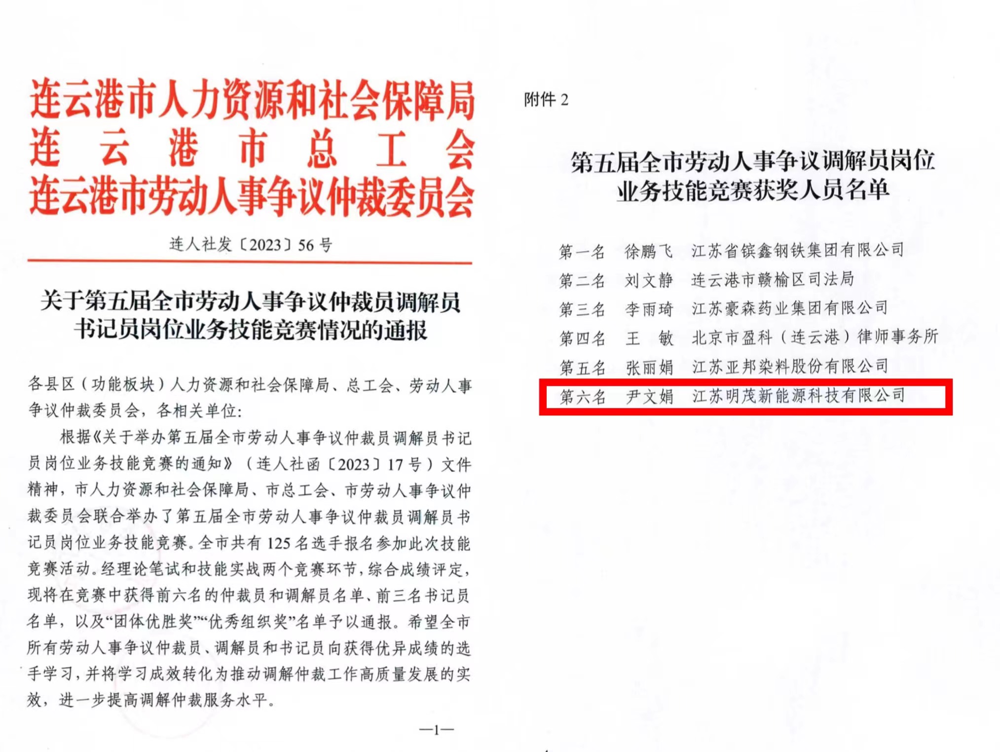 五月中旬,市總工會、市人力資源和社會保障局、市勞動人事爭議仲裁委員會共同舉辦了第五屆全市勞動人事爭議仲裁員調解員書記員崗位業(yè)務技能競賽。競賽經過理論筆試和技能實戰(zhàn)兩個環(huán)節(jié),根據(jù)綜合成績評定。經過層層選拔,明茂公司尹文娟同志在全市125名勞動人事爭議調解員中脫穎而出,取得了競賽第6名的優(yōu)異成績,展現(xiàn)了明茂公司的良好形象和精神風貌。
