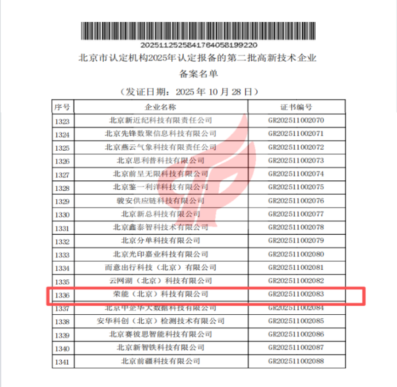 2025年11月25日,榮能(北京)科技有限公司(以下簡(jiǎn)稱 “榮能公司”)傳來(lái)喜訊:經(jīng)國(guó)家相關(guān)部門嚴(yán)格審核,公司正式通過(guò)國(guó)家高新技術(shù)企業(yè)認(rèn)定,成功獲評(píng)“國(guó)家高新技術(shù)企業(yè)”稱號(hào)(認(rèn)證編號(hào):GR202511002083)。