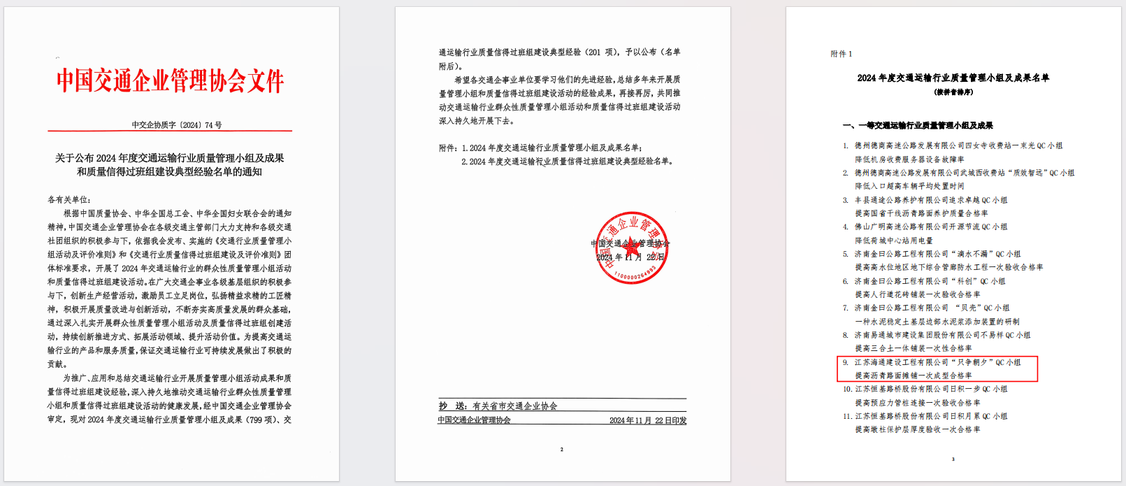 近日,據(jù)中交企協(xié)質字〔2024〕74號文《關于公布2024年度交通運輸行業(yè)質量管理小組及成果和質量信得過班組建設典型經驗名單的通知》,江蘇海建公司只爭朝夕QC小組及其成果《提高瀝青路面攤鋪一次成型合格率》被評為2024年度交通運輸行業(yè)質量管理小組及成果一等獎。