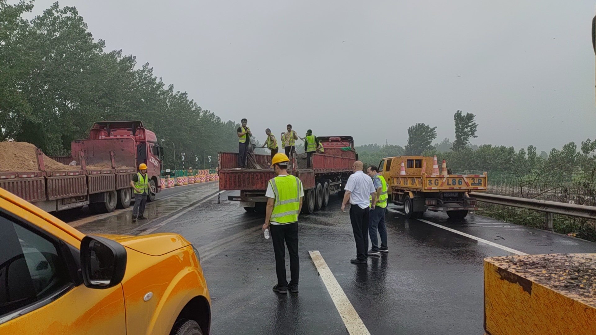豐達公司寧連高速D標項目部接到上級電話通知,立即組織應急處置人員與車輛第一時間到達現(xiàn)場清理。項目部組織應急隊伍32人,工程車輛12輛趕赴現(xiàn)場,迅速開展現(xiàn)場清理、沙石吸附、清掃推灰。直至10:26分,經(jīng)施工人員多方努力,路面油污終于清理干凈,受污染路面消除了安全隱患,道路恢復了暢通。