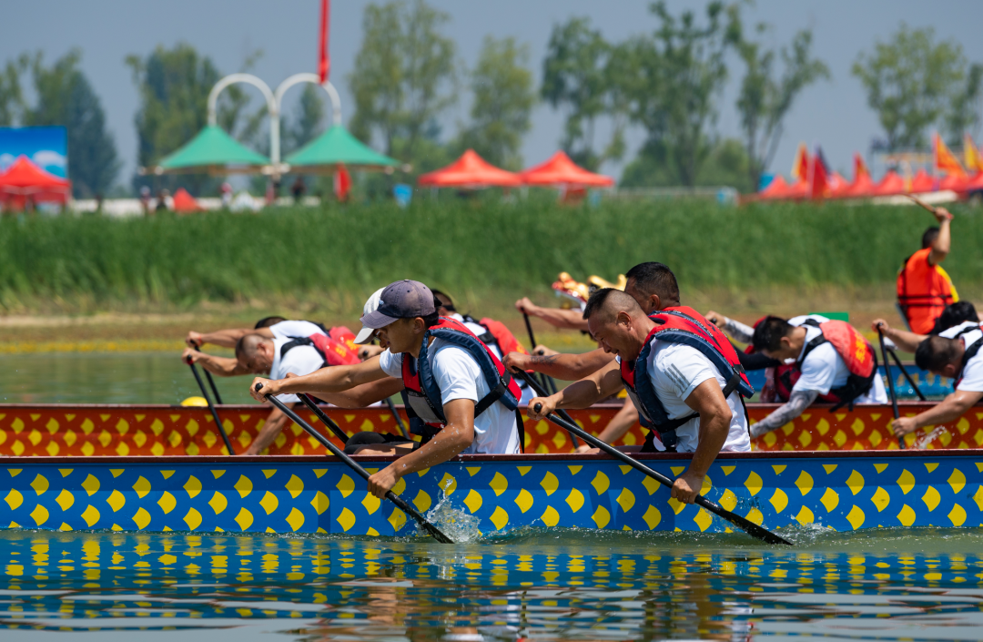 上午9點半,隨著一聲響亮的發(fā)令槍響,龍舟競渡正式開始!選手們擊水奮楫,劈波斬浪,向終點沖去,岸邊響起觀眾排山倒海的助威吶喊聲。飛濺的浪花、飛舞的龍旗、飛馳的龍舟,整齊劃一的鑼鼓聲和場邊觀眾的吶喊聲使現(xiàn)場氣氛瞬間升至沸點。
