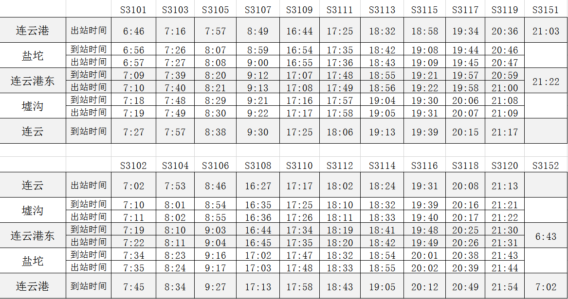 市域列車一期工程連云港站至連云站,線路全長35.1公里,沿線設(shè)置連云港、鹽坨、連云港東、墟溝、連云共5個(gè)客站。開通運(yùn)營后,市域列車每日有11對列車對開,10對在連云港站至連云站區(qū)間運(yùn)行,1對在連云港站至連云港東站區(qū)間運(yùn)行。