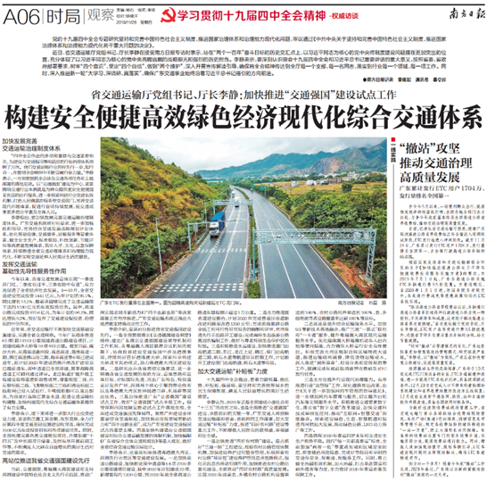 11 月28日,南方日?qǐng)?bào)A06版刊登了對(duì)省交通運(yùn)輸廳黨組書記、廳長(zhǎng)李靜的專訪報(bào)道。李靜表示,廣東交通系統(tǒng)將深刻認(rèn)識(shí)領(lǐng)會(huì)十九屆四中全會(huì)和習(xí)近平總書記重要講話的重大意義,按照省委、省政府部署要求,加快發(fā)展完善交通運(yùn)輸治理制度體系,高站位推進(jìn)我省交通強(qiáng)國(guó)建設(shè)先行,加大交通運(yùn)輸“補(bǔ)短板”力度,構(gòu)建安全便捷高效綠色經(jīng)濟(jì)的現(xiàn)代化綜合交通體系。報(bào)道詳情如下: