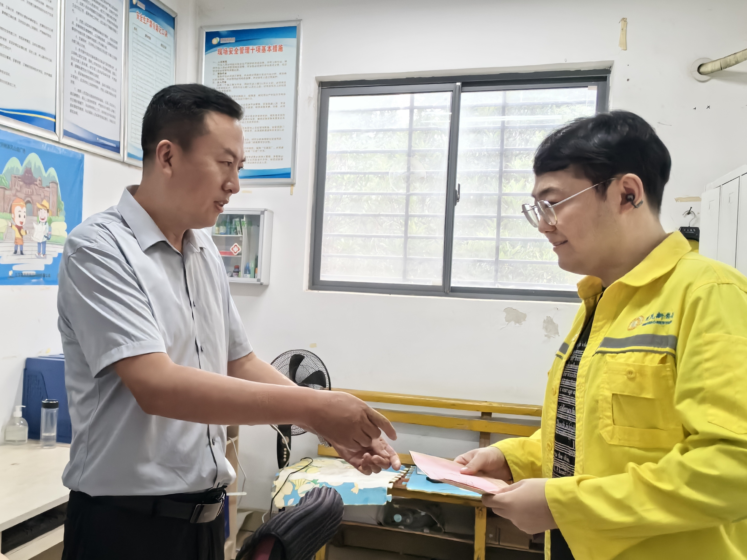 周輝一行首先前往中醫(yī)院,在病榻前探望了仍在住院治療的充電工孟憲強(qiáng),關(guān)切地了解了他的恢復(fù)進(jìn)展、治療方案及生活需求,送上了滿載祝福的慰問金和組織的殷切關(guān)懷。窗外雨聲淅瀝,病房內(nèi)暖意融融。隨后,慰問組趕赴了黨校場(chǎng)站,探望了已返崗工作的充電工丁嵐清。周輝在丁嵐清的工位旁,細(xì)致詢問了他因貧血住院后的康復(fù)狀況及返崗后的身體適應(yīng)情況,并親手送上慰問金,叮囑他務(wù)必保重身體,勞逸結(jié)合。一聲聲關(guān)切的叮囑,一句句暖心的鼓勵(lì),讓丁嵐清、孟憲強(qiáng)深受感動(dòng),真切感受到“明茂大家庭”如家人般的溫暖。