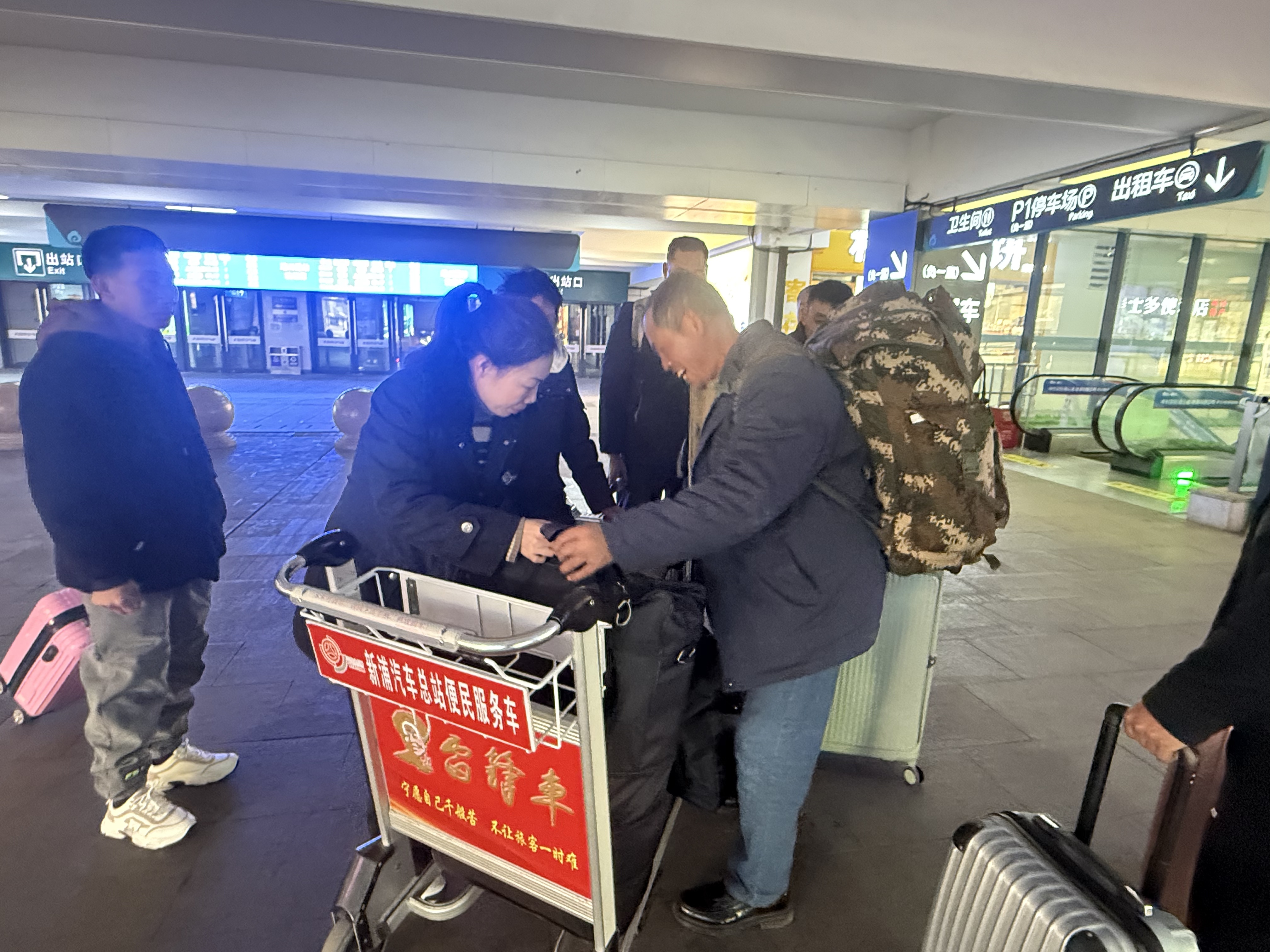 剛到高鐵站,他們就遇到了連汽定制客運(yùn)事業(yè)部“雷鋒車”驛站的“雷鋒車”手。熱心的“雷鋒車”手看到務(wù)工人員沉重的行李后,毫不猶豫地伸出援手。她們主動(dòng)幫助務(wù)工人員搬運(yùn)行李,引導(dǎo)他們有序地前往高鐵站,確保他們能夠順利趕上火車。